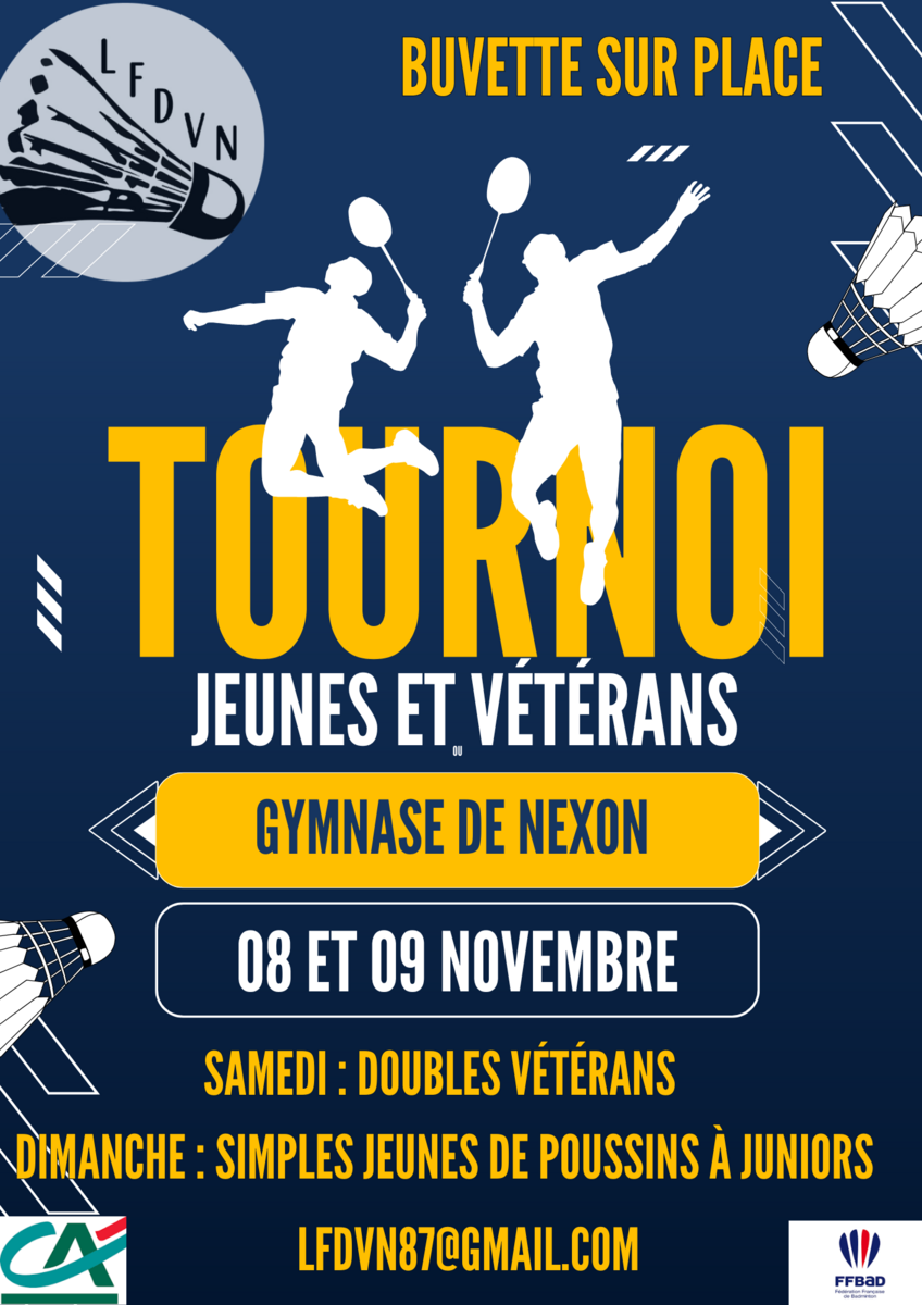 Les Fous Du Volant Nexonnais sont heureux de vous inviter à leur tournoi jeunes et vétérans de Nexon qui aura lieu les 8 et 9 novembre 2025.